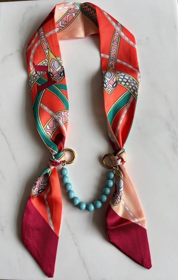 De sjaal combineert meerdere kleuren zoals oranje, groen en rood waardoor je eindeloos kunt matchen met je kleding. Het leuke is dat de Bandana aan beide kanten verschillende kleuren heeft. Je kunt hem dus omdraaien. Hoe leuk is dat! De ketting kun je los dragen (zie foto) of met de sluiting vast maken. Zo krijg je dus een hele andere look.